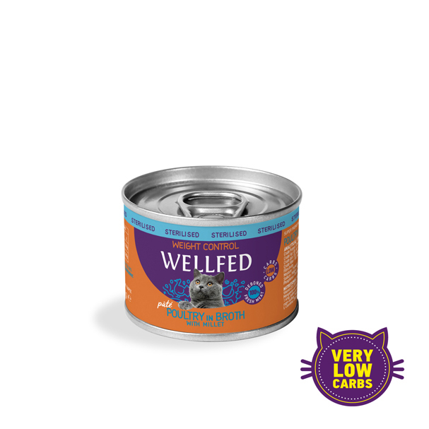 طعام القطط ويلفد للتحكم في الوزن للقطط المعقمة “WELLFED Weight Control Poultry with Millet” تركيبة طعام رطب تحتوي على قطع دجاج بالدخن مغموسة في المرق.