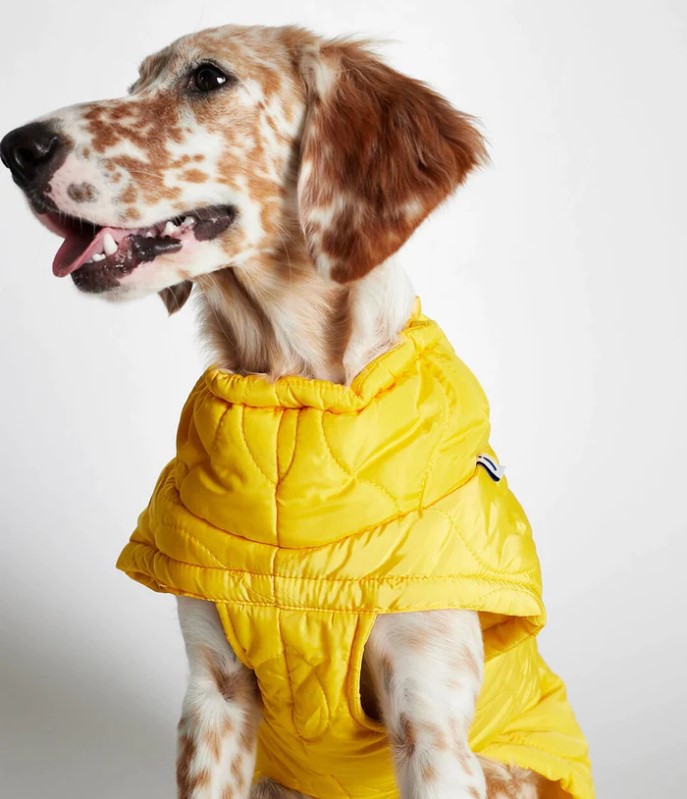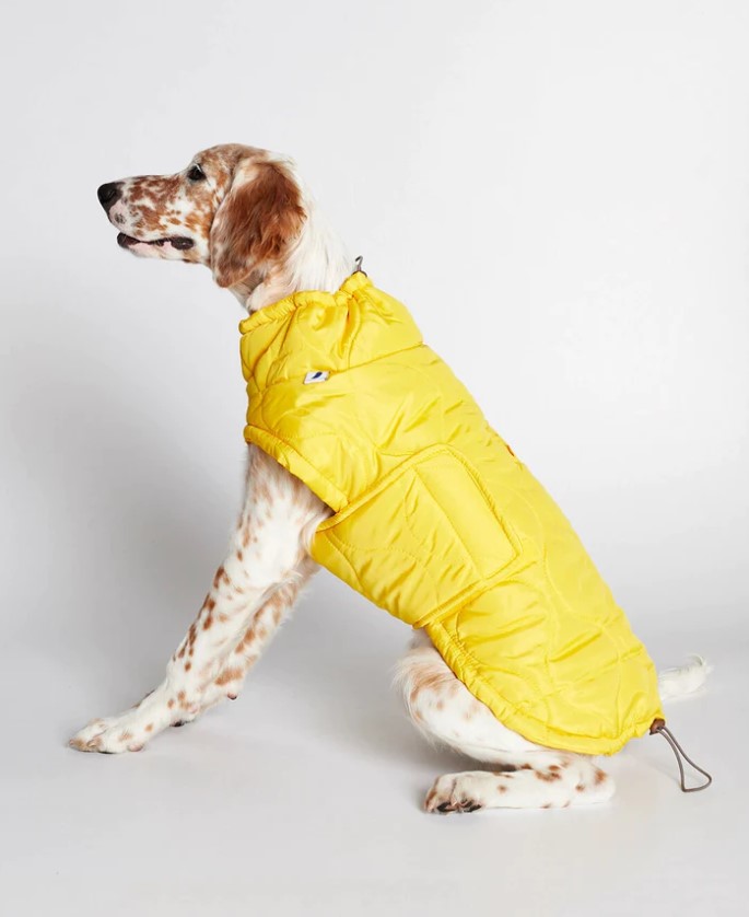 Our yellow Christmas dog puffer coat vest is sleeveless and has been verified by our in-house veterinarian. It has 2 eyelit opening for the leash or harness for the ease of quickly dressing your dog to pop out for a walk.