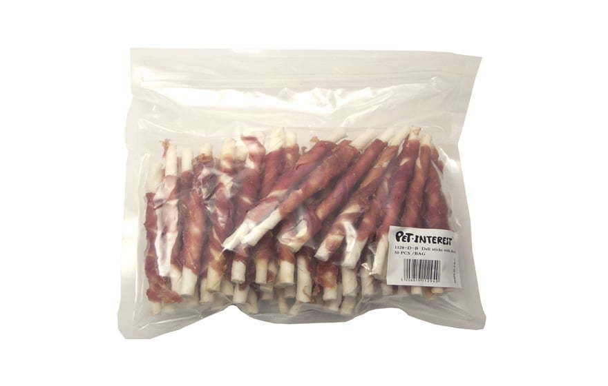 Chewing stick made of ox skin wrapped in duck fillet, for dogs up to 15 kg. It is suitable for the relaxation of your dog while eating and at the same time it strengthens the mouth muscles and the muscles of your dog’s body by chewing.