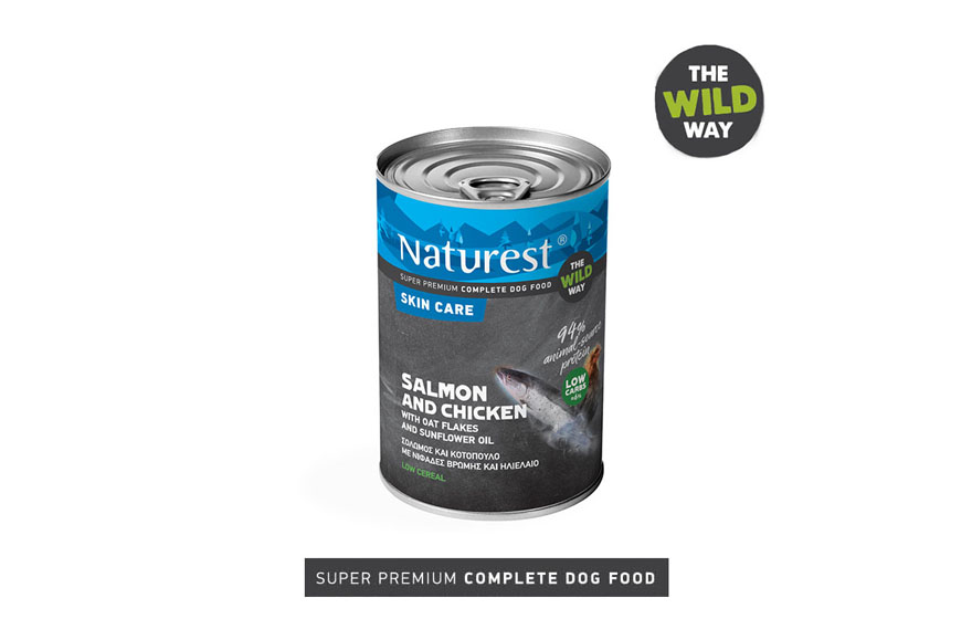 This wet meal helps dogs with skin allergies and hair loss. It contains 65% meat and vital edible offals (20% chicken and 10% salmon rich in Omega3), broth 28,5%, 3% potatoes(for the necessary amount of starch), 2%oat flakes which are ideal for the hair, 1% minerals and 0,5% sunflower oil. The combination of Omega3 and Omega6 fatty acids of oats, is ideal for a complete and balanced diet aiding in the same time hair issues.