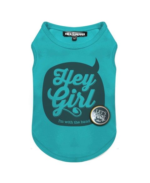 Comics Tee Shirt: Pup star style! “Hey Girl, I’m with the band” design, detachable “Let’s Party” badge, comfy cotton, Milk &amp;amp; Pepper.</p>